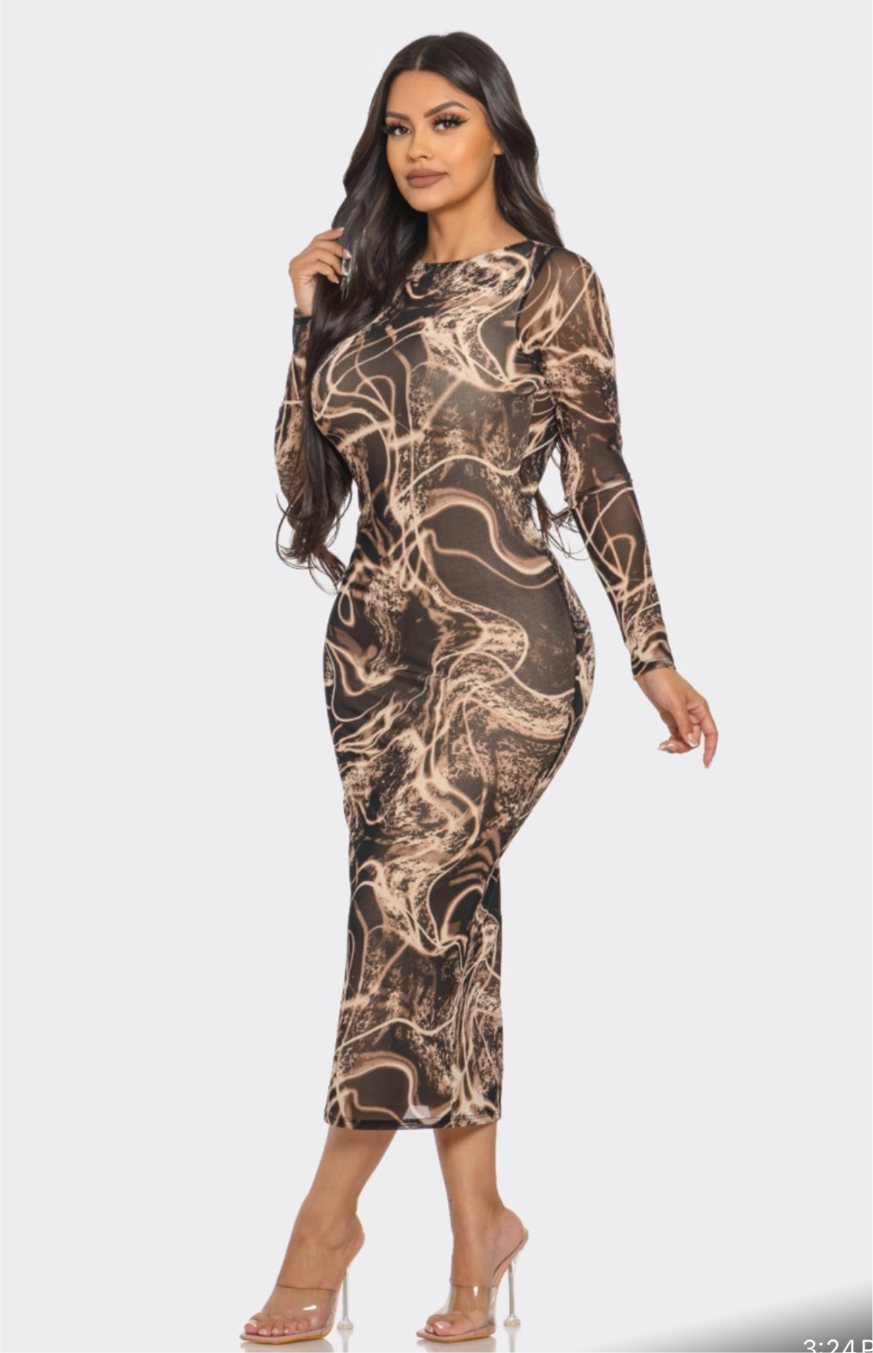 The Angela Dress is a versatile and stylish choice for any occasion. The print mesh and lining design adds a unique touch, while the tube long sleeves and midi length provide a flattering fit. With its open back, this dress is sure to make a statement. Perfect for those who want to stand out with confidence.