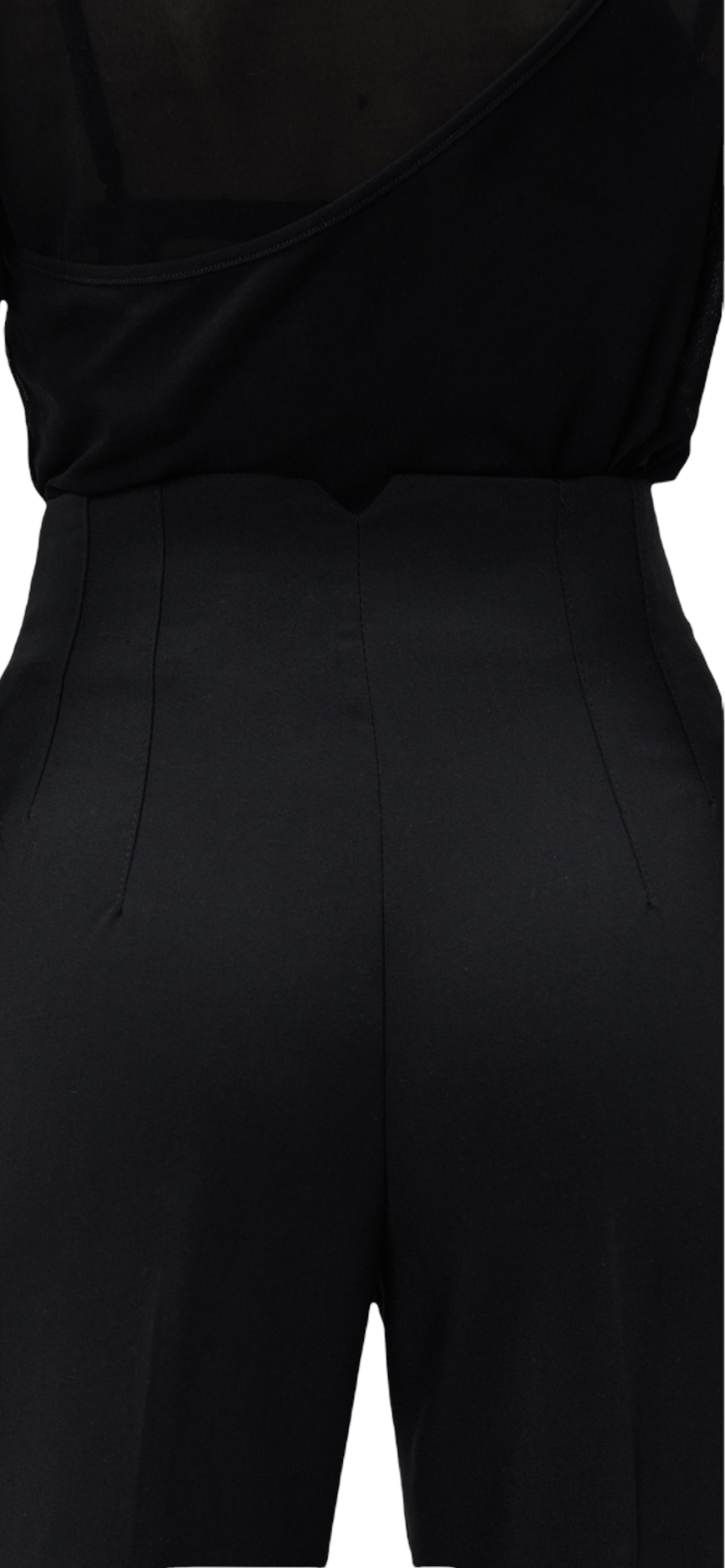 High waisted pants with pronounced seams at front and back. Front pockets. Front zip, metal hook, and inside button closure.