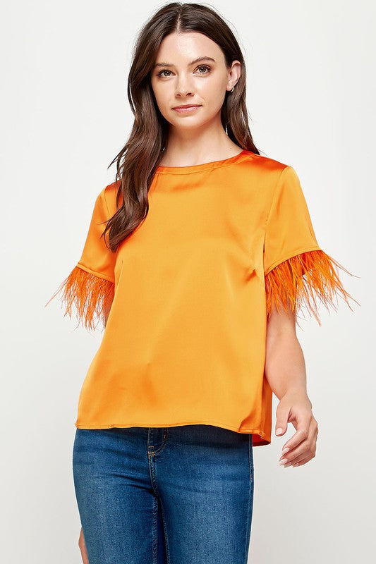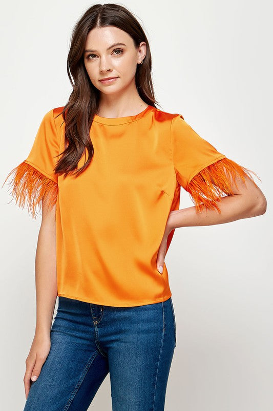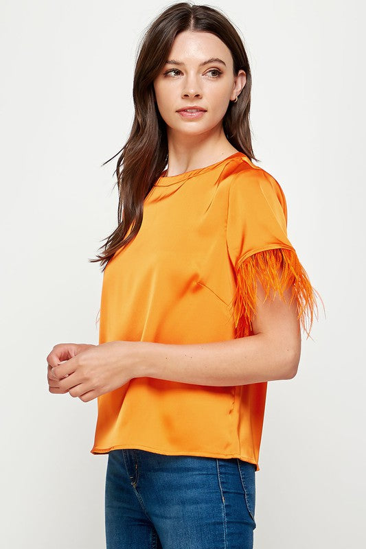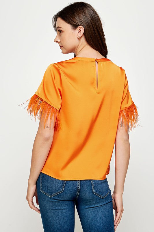 with keyhole closure at back, short sleeve with feather trim, round neck,