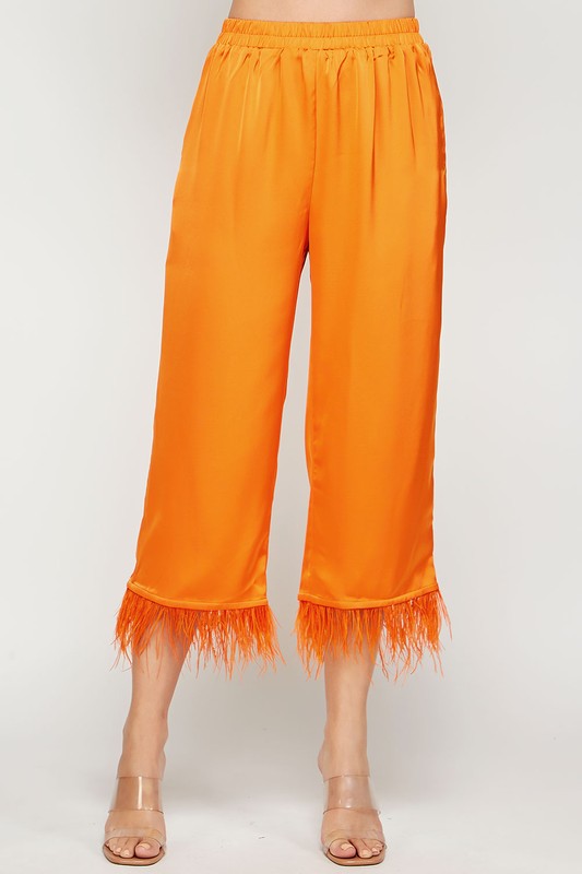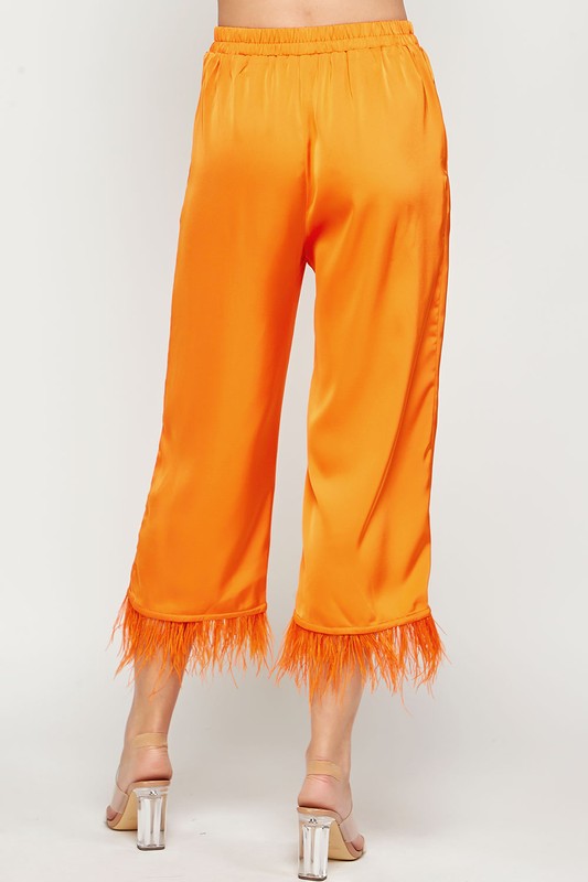 Feather trim ankle pants in satin fabric. This style features elasticated waist band,