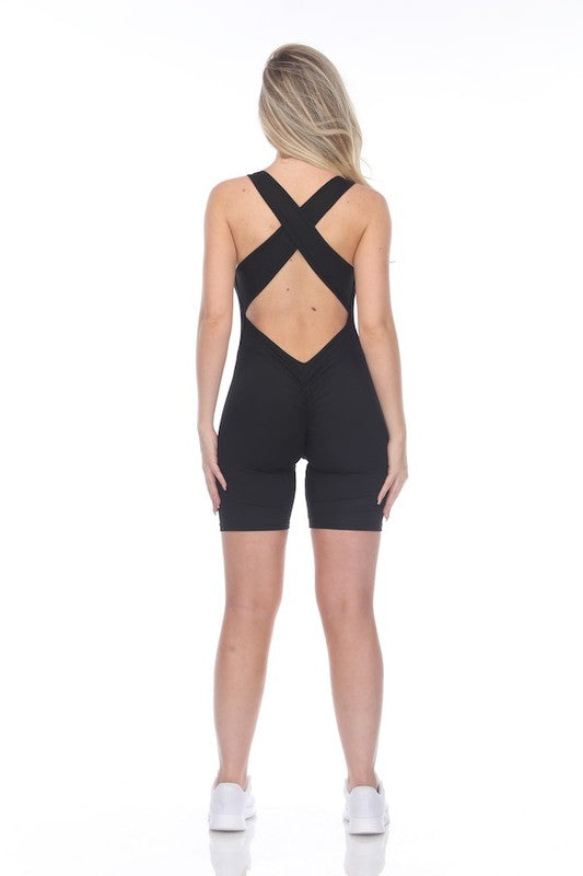 Our cotton rib romper is a "Must-Have" for your everyday lounge collection. Fabricated in our ultra-soft and breathable material. Detailed with a criss-cross back, deep v-neckline, and ruched scrunch but inserted to lift and slim the silhouette. - Double-Knit Fabric