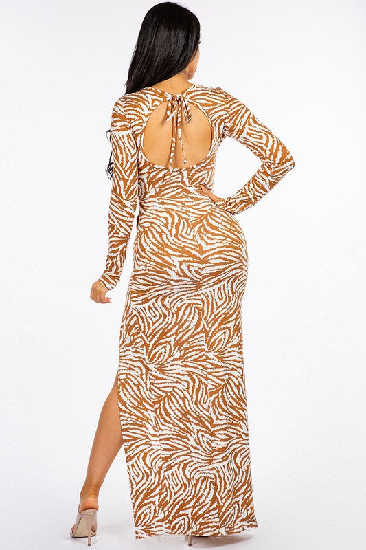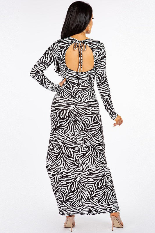 ZEBRA PRINT LONG DRESS WITH HIGH SLIT, KEY HOLE FRONT AND OPEN BACK