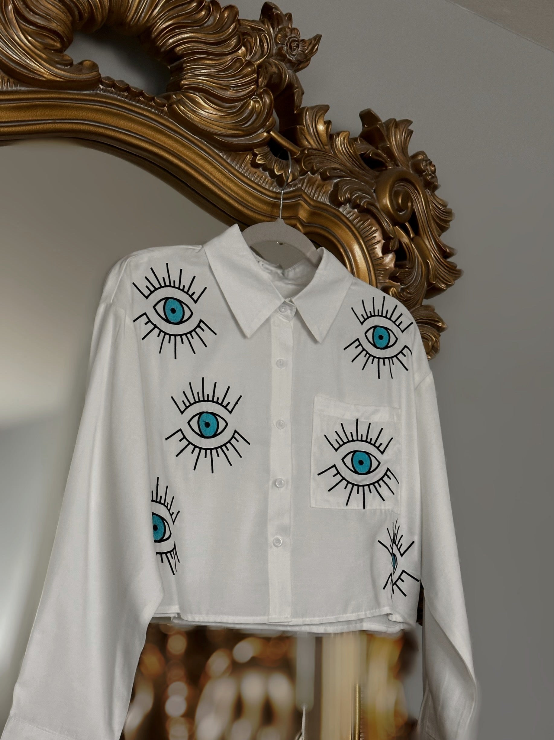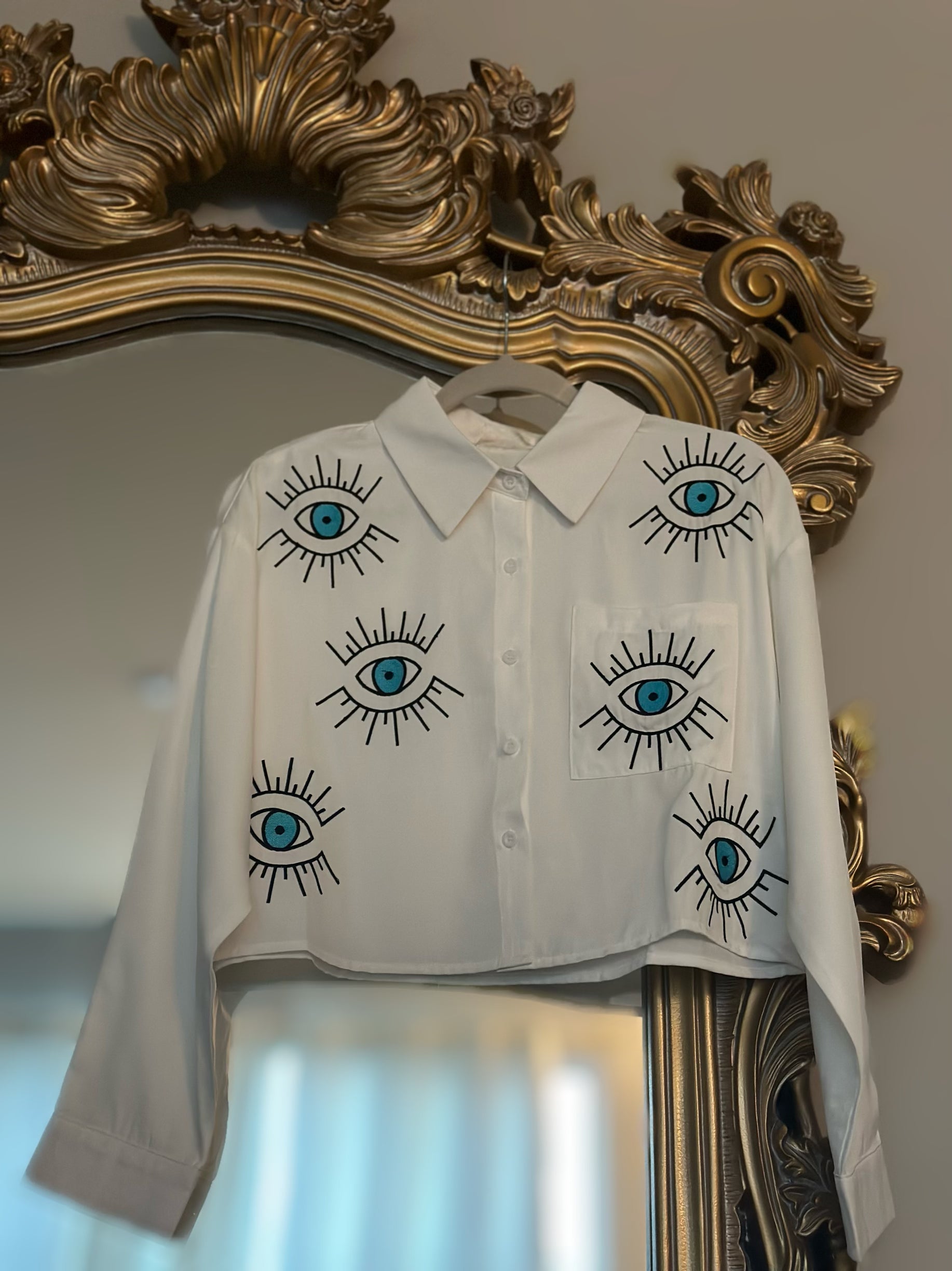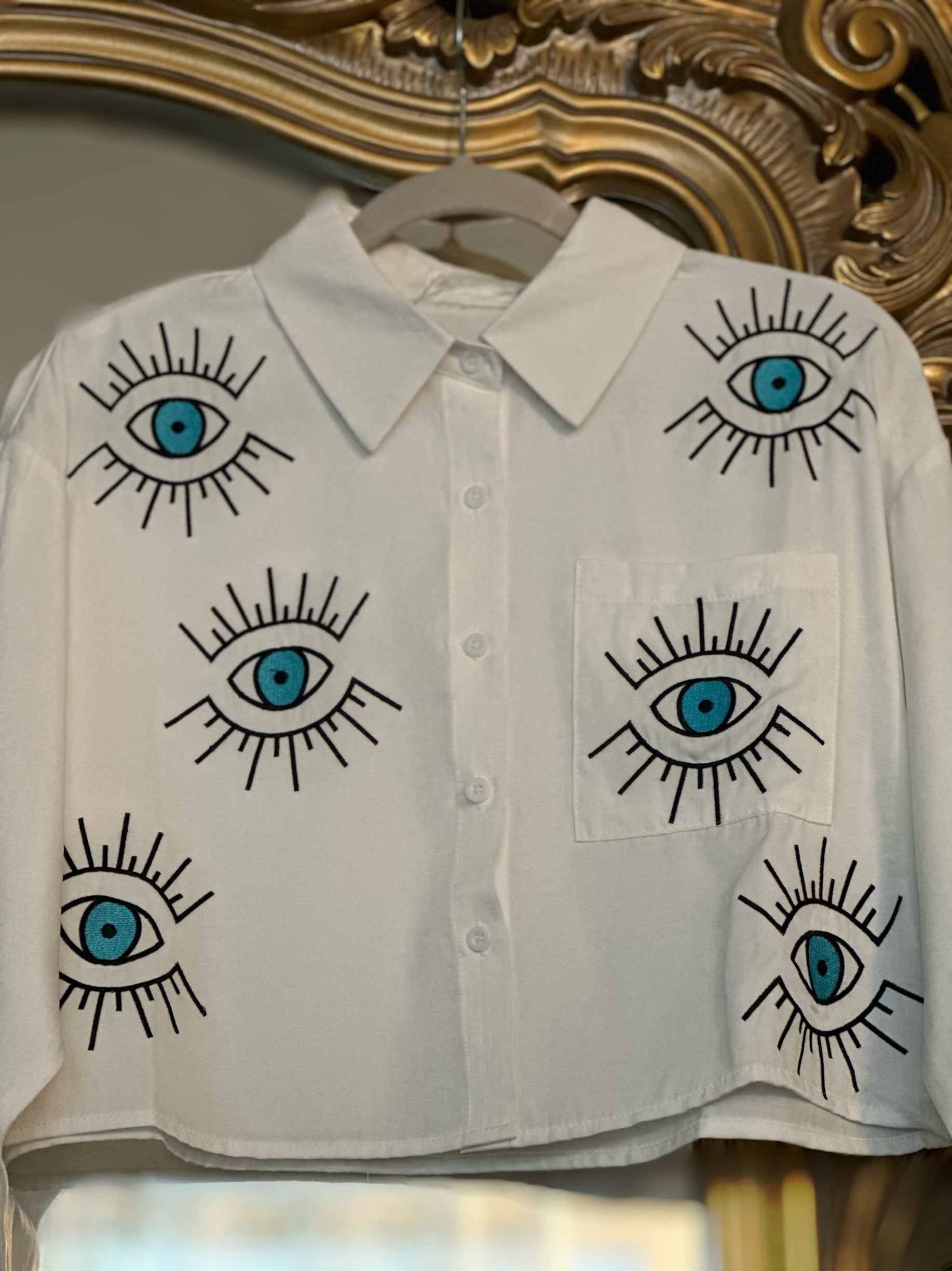 "Optimize your style and protection with our Evil Eye Crop Shirt. The sophisticated design adds a touch of elegance while shielding you from negative energy. Experience the benefits of fashion and safety with our Protect Top."