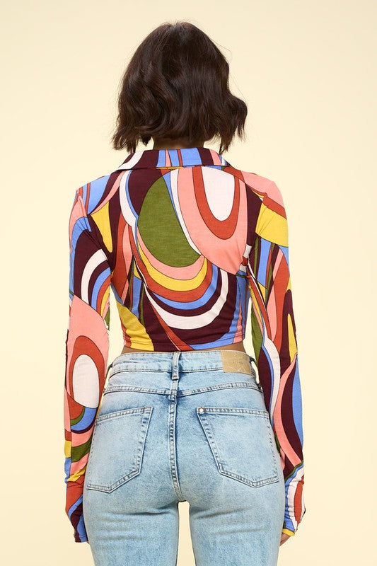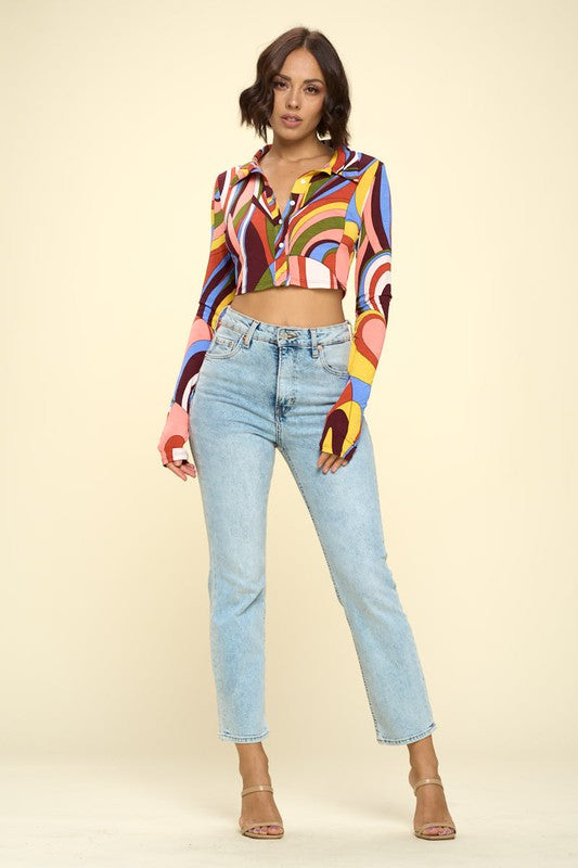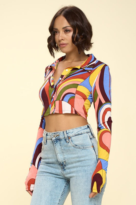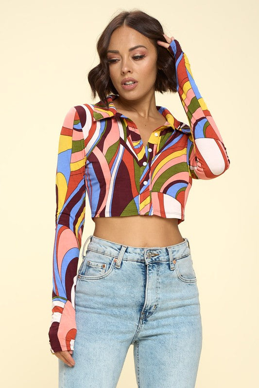 -Crop Top -Collar Button Up -Long Sleeves -Casual MODEL IS 5'9 AND IS WEARING A SIZE SMALL