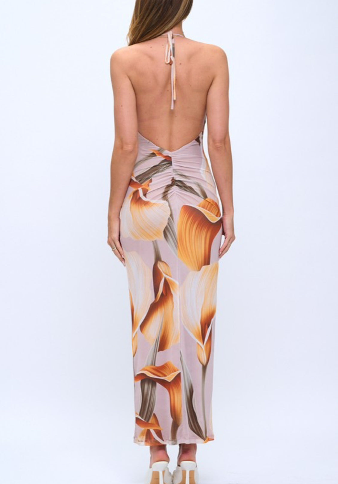 Indulge in the effortless elegance of the Kamalia Floral Cowl Neck Halter Maxi Dress. Featuring an open back and scrunch back design, this dress allows you to flaunt your curves while maintaining a sophisticated look. Perfect for any occasion, this dress combines comfort and style in one stunning piece.