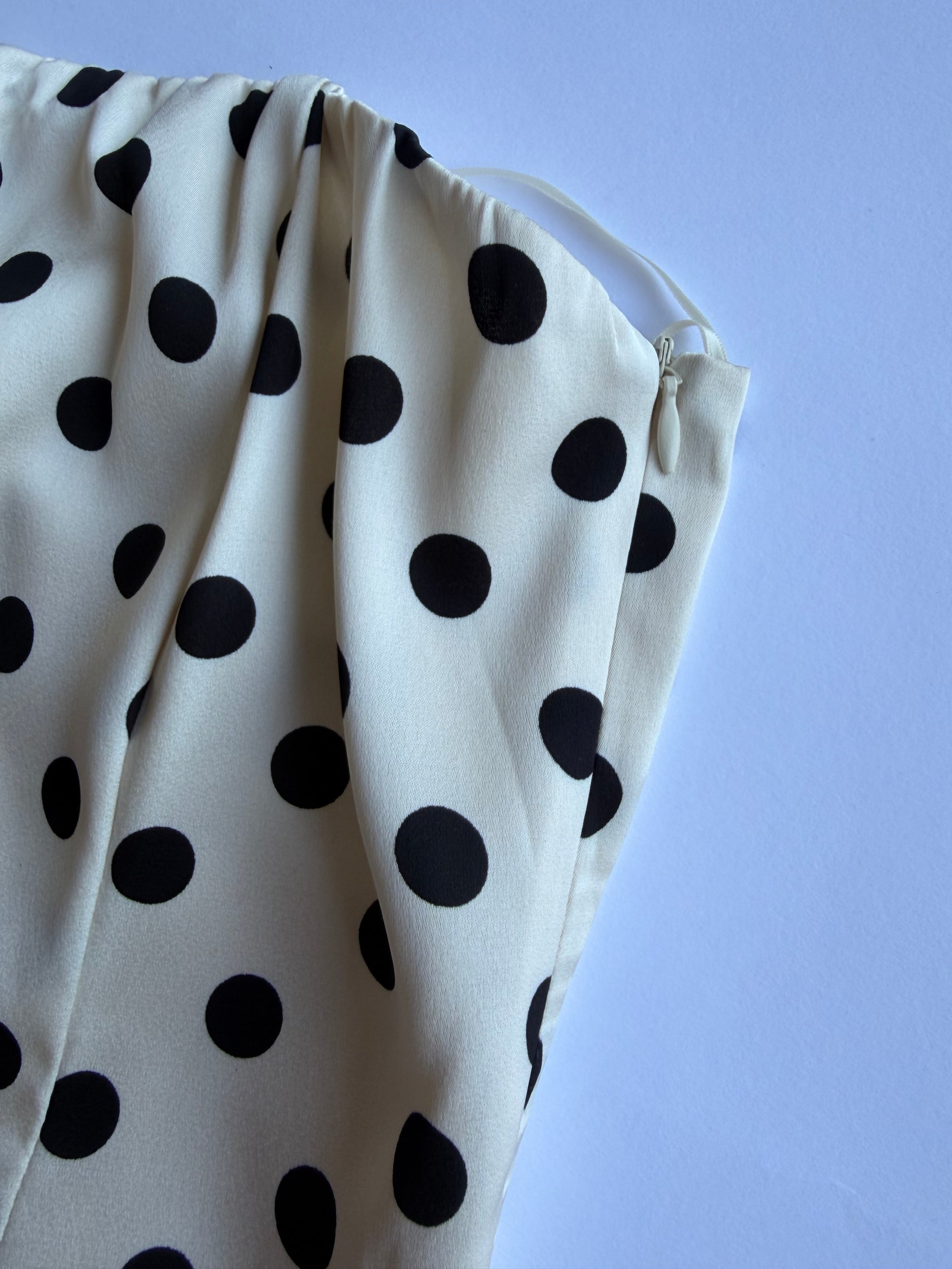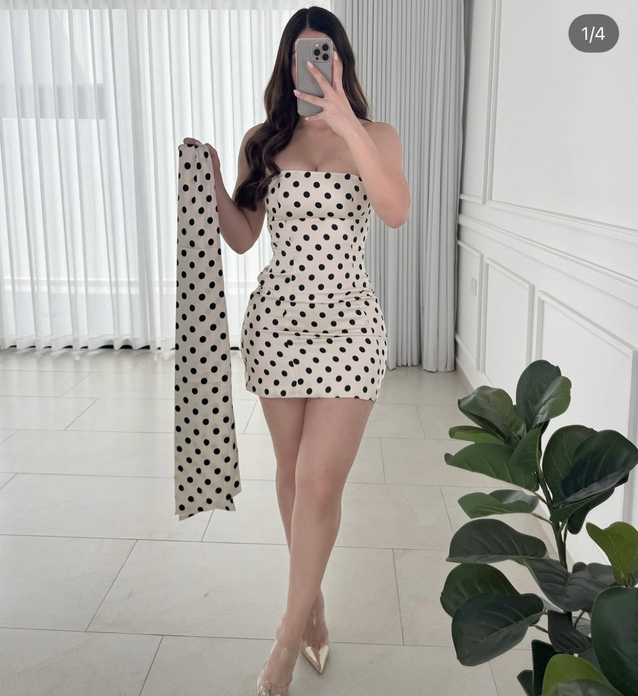 The Paris Polka Set features a polka dot print tube top mini dress complemented by a stylish scarf. The inclusion of a side zipper enhances ease of wear, ensuring a secure fit. This combination offers a sophisticated yet playful option for various occasions, appealing to fashion-conscious individuals seeking versatility.